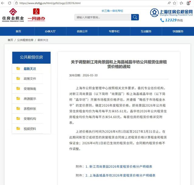 上海市公积金管理中心按照相关文件要求,委托专业估价机构,对上海晶城晶华坊(以下简称“晶华坊”)开展市场租赁价格评估,并遵循“略低于市场租金水平”的定价原则,确定2026年度租赁价格,即晶华坊2026年公共租赁住房租金均价为每月每平方米54.60元。每套住房的租赁价格详见附表。
